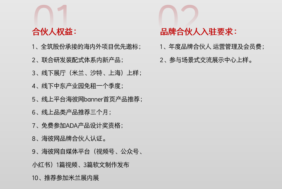 此外,海彼网推出全球品牌合伙人计划,合伙人可享有海内外项目优先邀标、线下展厅上样、中东产业园免租、线上平台推广、免费参与 ADA 设计奖等十大核心权益,入驻需满足年度运营管理及会员费缴纳、参与场景式交流展示中心上样等要求。