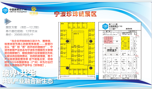 当2026年家居行业向8万亿市场冲刺,存量深耕、智能升级、品牌出海成为核心增长极,单打独斗的时代早已过去,选对平台,就是抢占万亿红利的关键。如今,2026全新“珍珠链”展区升级启航,承载着宁波1300亿家居产业链的底气,联动中国建博会(广州)主办方重磅资源,以更优质的阵容、更全面的赋能、更精准的对接,向宁波优质家居企业发出诚挚邀约,共赴这场行业顶级盛会!