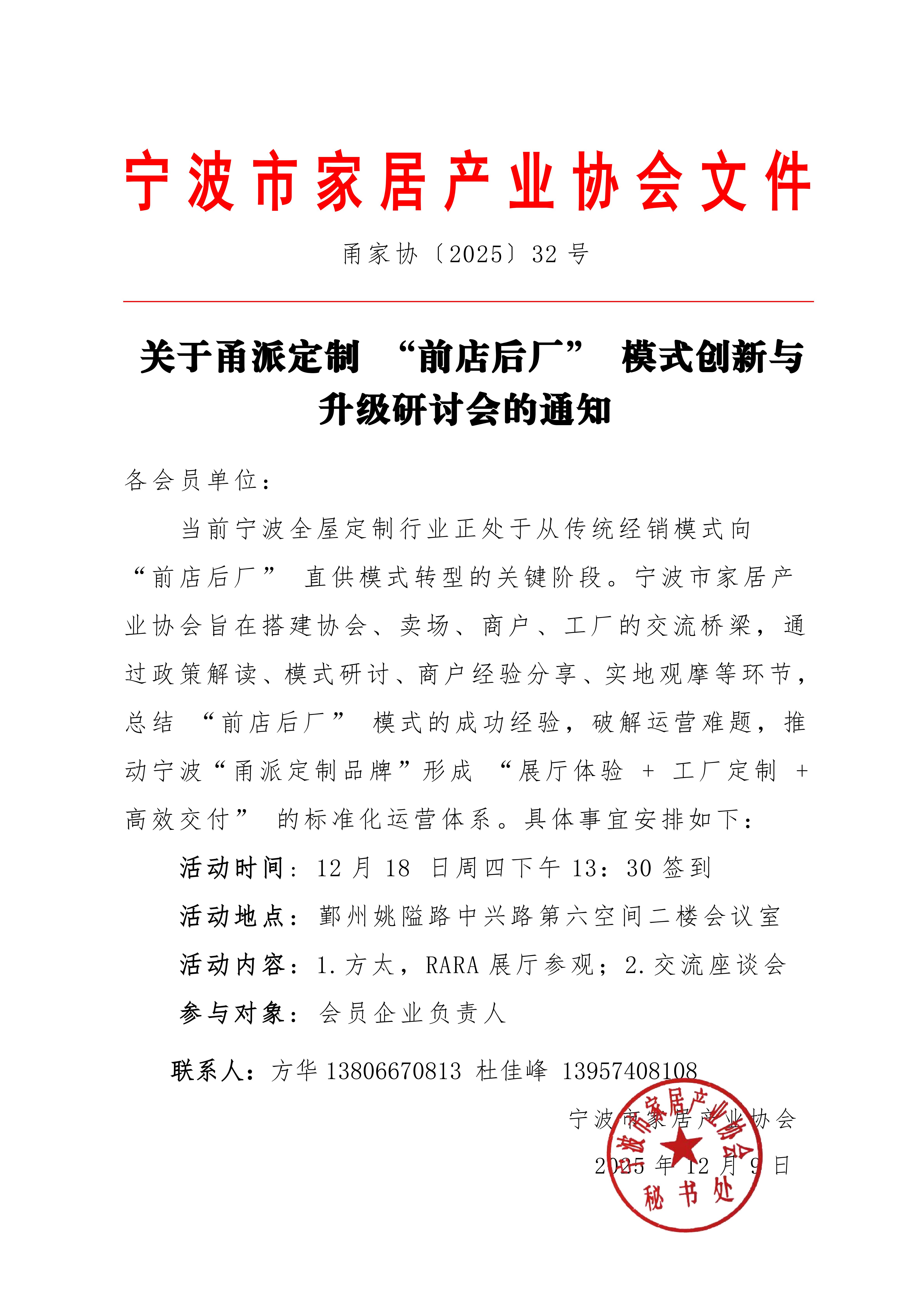 > > 甬家协〔2025〕32号关于甬派定制 “前店后厂” 模式创新与升级研讨会的通知