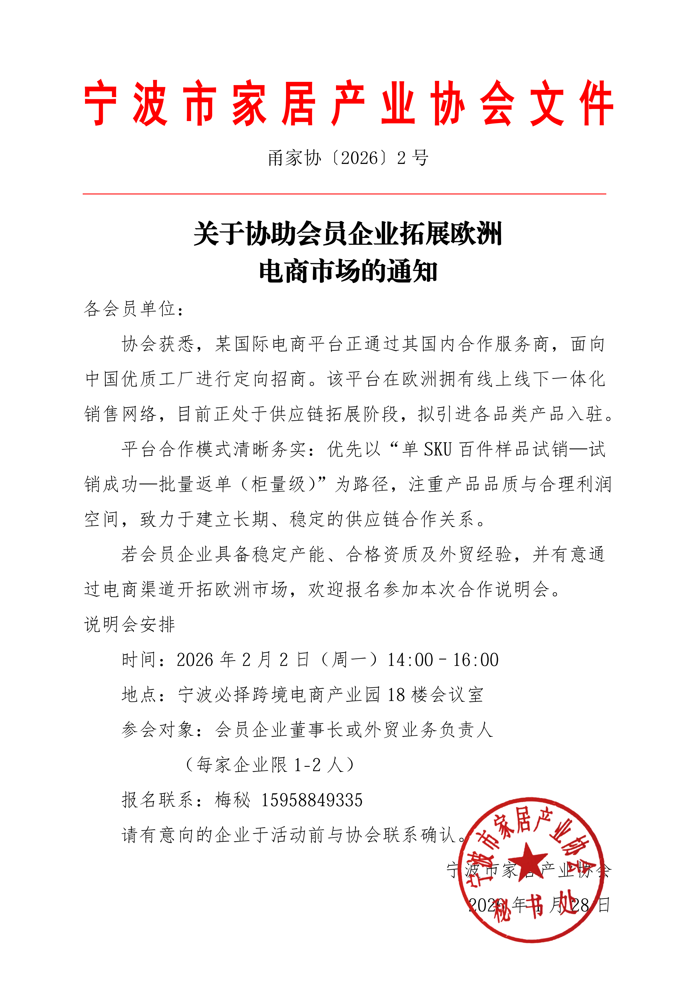 > > 甬家协〔2026〕2号关于协助会员企业拓展欧洲电商市场的通知